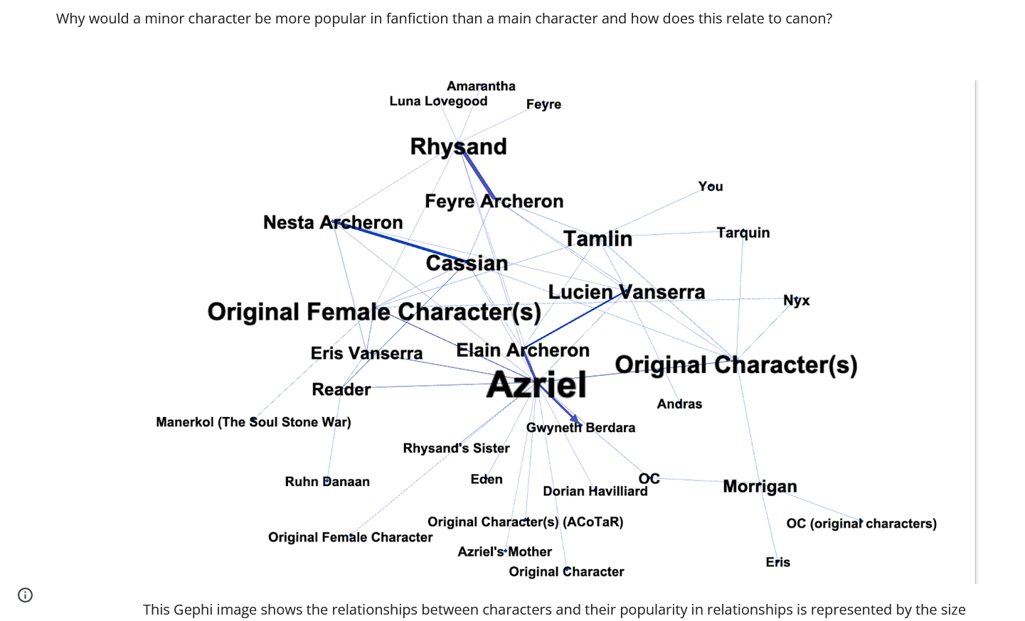 Since much of the fanfiction written and read today is in a digital format, throughout the semester students considered tools to understand the huge number of stories. Their digital final projects focused on their fandom of study, including a driving research question, creation of a corpus, analysis of data, and visualizations and write-up for a final project that detailed their findings. All student work is shared with permission.